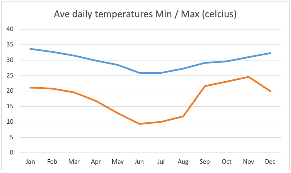 The Lowveld has subtropical climate with hot, humid summers and mild, dry winters. During summer midday temperatures can exceed 40 degrees Celsius / 104 degrees Fahrenheit. At night, in summer, temperatures seldom drop below 20 degrees Celsius / 68 degrees Fahrenheit. During the winter months midday temperatures average around 26 degrees Celsius / 79 degrees Fahrenheit and at night temperatures seldom drop below 5 degrees Celsius / 41 degrees Fahrenheit.