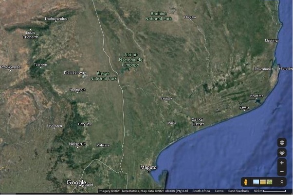 In the satellite image above one can see the Kruger National Park, with the international border with Mozambique. Singita Lebombo lies in the eastern centre of the Kruger National Park between the wording ”Kruger National Park” and “Park Nacional de Limpopo”. The warm Indian Ocean can be seen to the east of Mozambique. To the west of the Kruger National Park one can see a green patch extending northwards near the areas listed as ‘Nelspruit’, ‘Hazyview’, ‘Tzaneen’ and ‘Louis Trichard’. This green patch is caused by the forests that grow on the eastern side of the escarpment. To the west of this lies the great Central Plateau of South Africa / the Highveld. – screengrab from www.google.com/earth.