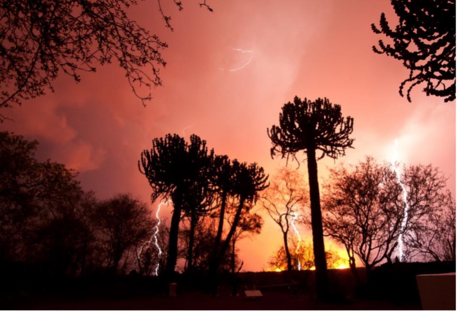 During our summer months we do, on occasion, experience storms with massive cumulonimbus clouds and fantastic lightning displays. If we receive lightning storms in late spring (November), when the grass is still dry and the rains have not properly fallen yet, the bolts of lightning can cause veld fires to spring up and burn the bush.