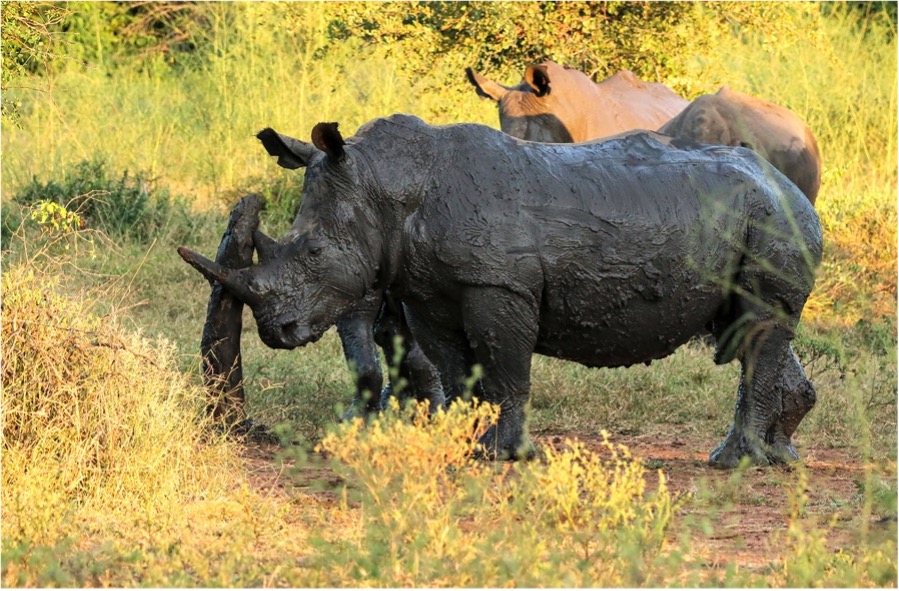 A white rhino bull makes the most of the muddy pans and a perfect rubbing post for horn maintenance.