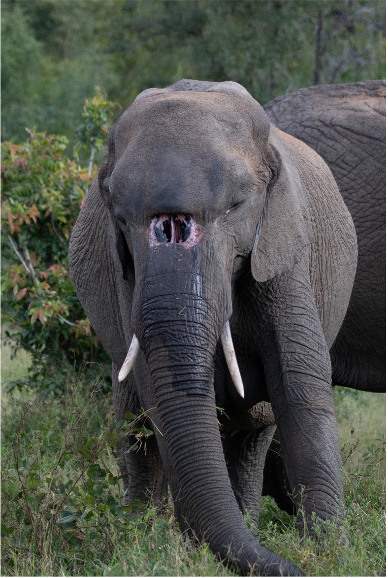 Rhandzekile’s condition is remarkably good, especially after this year’s exceptional rainfall where the grass and trees have been abundant, high in nutrients and water has been available all over. Feeding is no problem for her, however drinking is facilitated by sucking up enough water that doesn’t reach the hole in the trunk and then bending the trunk, lifting it up and spraying the water into her mouth.