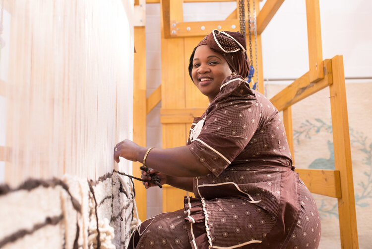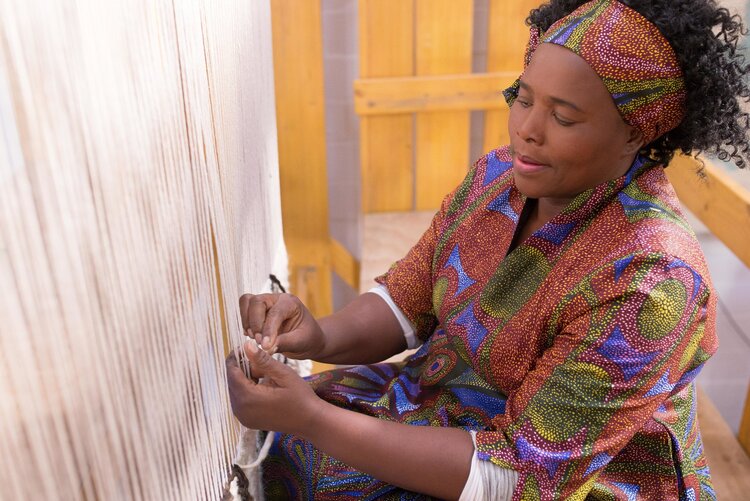 Singita works with artisans from around Africa to create bespoke design. Here, weavers Thembisa Sam and Nomtheliso Ngxomi work on textiles