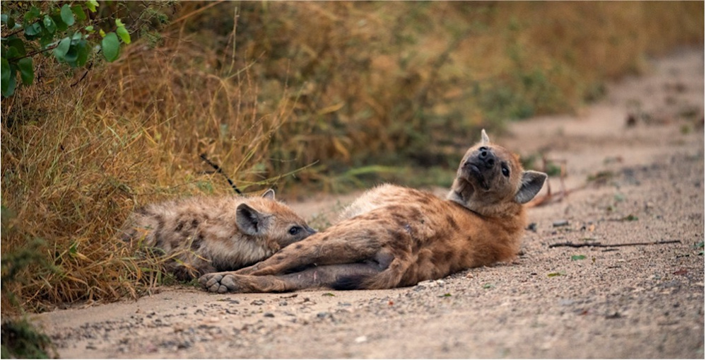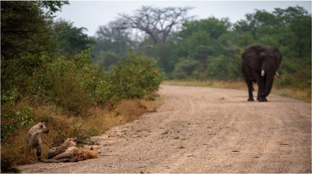 An experienced hyena mother chose to suckle her cubs right on the side of the main thoroughfare that cuts through the reserve. Running underneath the road at this point is a big drainage pipe and it was clear from all the tracks and trampled vegetation that she’d stowed her cubs in the drainpipe for safety. While we watching the tranquil scene a large bull elephant appeared from around the bend and came marching on determinedly. We stayed where we were and so did the hyenas, but the cubs were the first to give way and then so did the mother. Once the traffic had passed we all calmly went on our own way again. Such a special scene to witness and a reminder to stay with a sighting and not rush off in search of the next best thing.