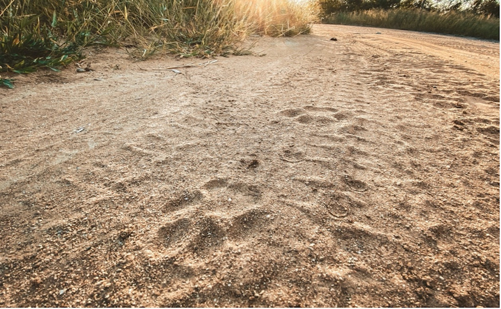 It didn’t take long before we came across a perfect set of tracks, imprinted into the soft sand of Pangolin Road, south of the lodges. We noticed that the tracks belonged to not one, but two leopards who had been walking along the road together. We got out of the vehicle and inspected further, beginning to piece together the imaginative visuals of what appeared to have been a female leopard and her cub moving along the sandy road.