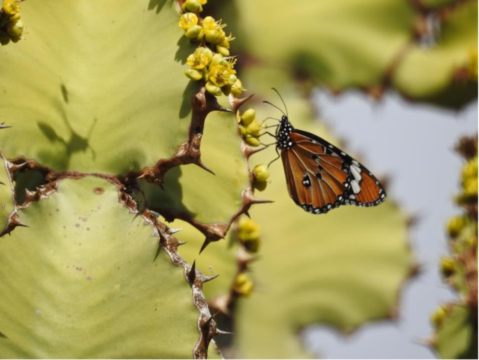 African monarch butterfly feeding on the flowers (cyathiums) of a bushveld candelabra tree.