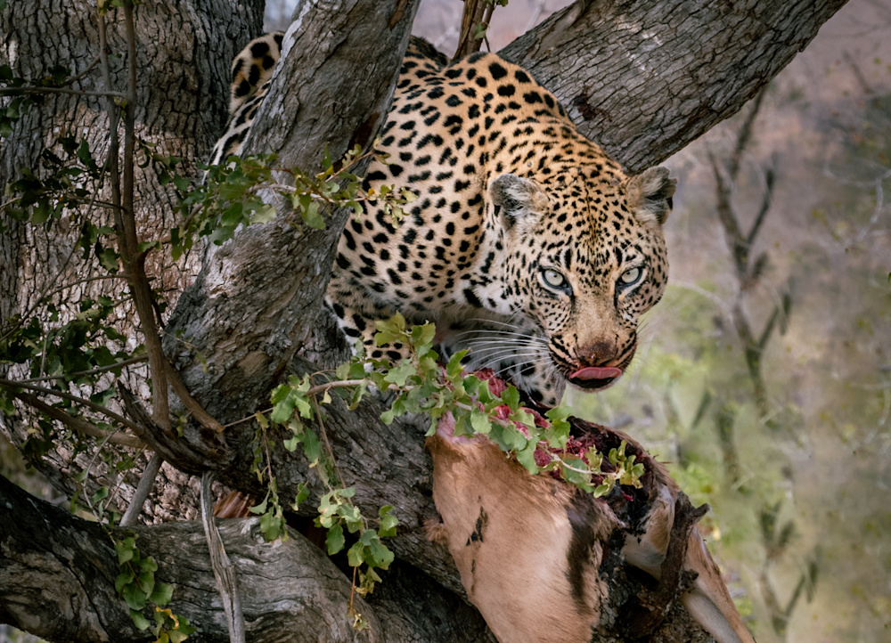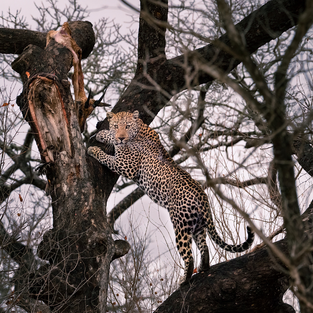 Nyeleti Arrives. Intense, sad, riveting, emotional, and amazing. This was an incredible sighting. We had seen the Ravenscourt female and her two cubs the day before. While following leopard tracks out of the lodge the next day, we heard a large commotion. We came upon this scene. The male was, at the time, unknown. He had just arrived into the Sabi Sands and was looking to establish dominance. Apparently, he had killed one of the Ravenscourt’s cubs. There was serious chaos around the scene. Elephants were trumpeting and on their way; hyenas were at the foot of the tree waiting for scraps and we were told that the Ravenscourt female was approaching. The leopard did eventually establish dominance and was named Nyeleti. He still rules today. Boulders Lodge
