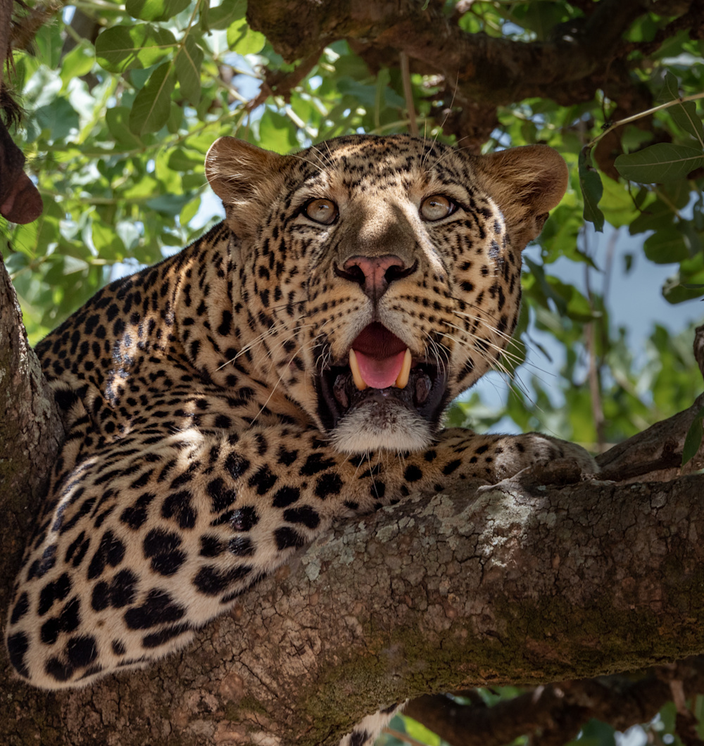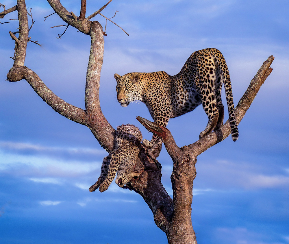 Mobeni. Mobeni is a very shy leopard who is not regularly viewed. We heard she had been located the day before, so we set out to see if we could find her. From a distance, we saw her in a tree with a carcass above the dam. It took us a while to approach so as not to scare her off. As she relaxed with our presence; amazingly, she let us get extremely close. She was very curious about us but remained calm. We stayed for some time to watch her feed. Eventually, she was chased away by a hyena at the water hole nearby. Ebony Lodge