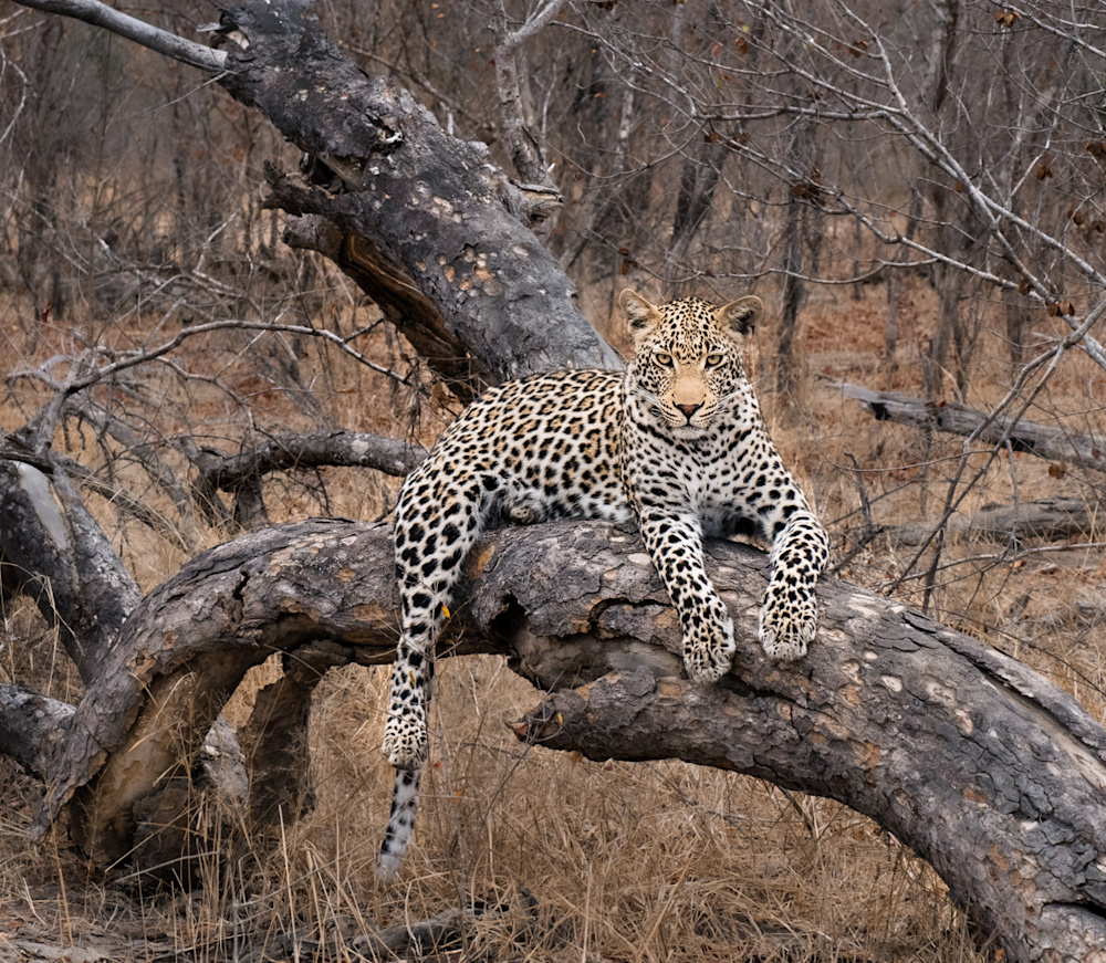 Tavungumi. It was a drizzly morning, but we decided to head out to see what we could find. One minute out of the lodge, we came upon Tavungumi who was just starting to establish his independence from Schotia, his mother. It was quite an adventure as we spent two hours following this young, newly independent male through his day. After two unsuccessful impala hunts and being chased up a thorny tree by hyena, he decided to take a rest on this fallen tree. Ebony Lodge