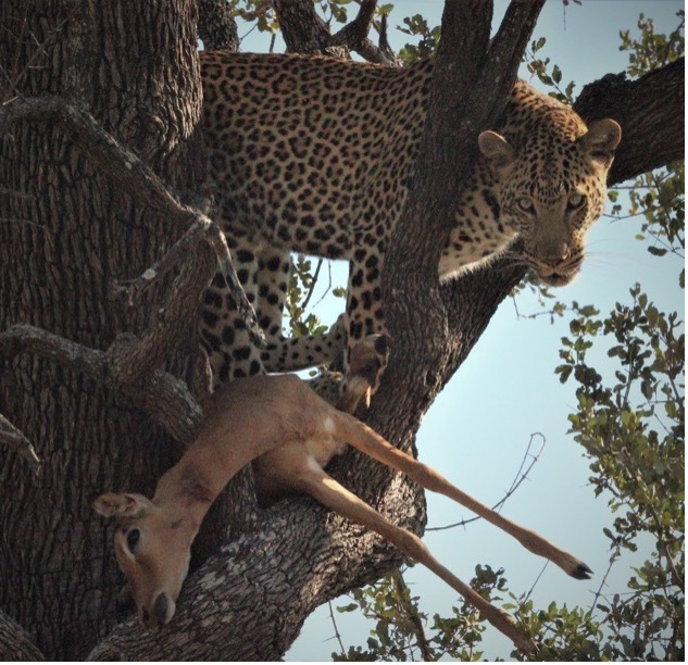 In absolute disbelief of what we had just seen, the leopard dragged his limp prize to a very large leadwood tree and in yet another display of power and grace, hoisted the impala and wedged it between the branches. Content in his performance for the morning, he climbed further up into the tree and found a comfortable branch to straddle and rest.