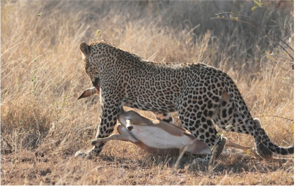 During the small scatter caused by the hyena, we noticed a female impala struggling to keep up with the rest of the herd. We weren’t the only one who noticed and the leopard quickly found new inspiration to keep on the trail of these impala and we all sensed that it was not over yet! As we were repositioning our vehicle, we missed the fact that the limping impala had taken some shelter in a thicket as she could not keep up with the rest of the herd. The leopard hadn’t noticed it either, but due to his incredible patience and calculated approach, he became aware of her position when she flicked her ear to chase away a pesky fly that was buzzing around her head. In an approach that was perfectly executed, the leopard got within five metres of the completely unaware impala, paused for what seemed like an eternity, and then exploded into action. The impala reacted and jumped in an attempt to evade the charging cat but was too slow. He caught her mid-air with his front left paw, razor-sharp claws fully exposed, catapulting his body around hers and pinning her down. In the split second that followed he clamped down with a powerful bite into the back of her neck, severing the spinal column almost instantly. There was only a small bleat and then silence…