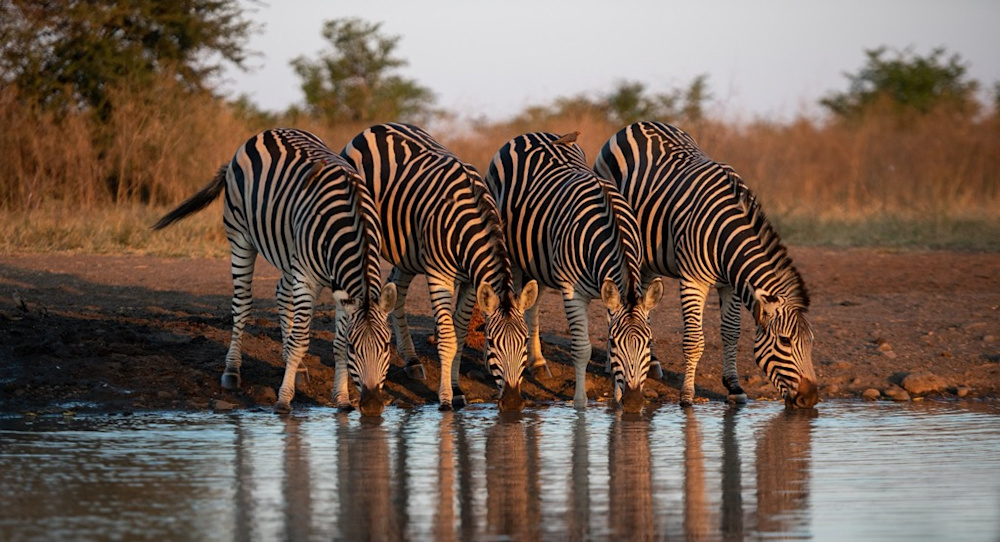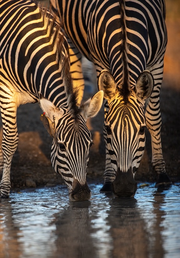 It’s wonderful when the planets line up and you have perfect light and a great sighting. That happened when we were in the underground photographic hide, eye level with the water, in the late afternoon golden hour, and these zebras plucked up the courage to come and drink.
