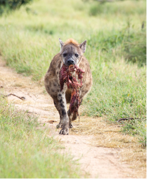 Leaving the den-site which is usually a termite mound dug up by an aardvark, hyena may travel up to 70km for food. Hyenas are opportunistic hunters, catching larger prey, and smaller prey such as hares, birds and reptiles. They eat carrion which they detect by smell and the sound of predators feeding or prey alarm calls. Their senses of smell and hearing are acute. Spotted hyena scent mark their territory through smearing a grass stem with a strong smelling liquid that is yellow and turns black over time. This shows how strong hyena are.