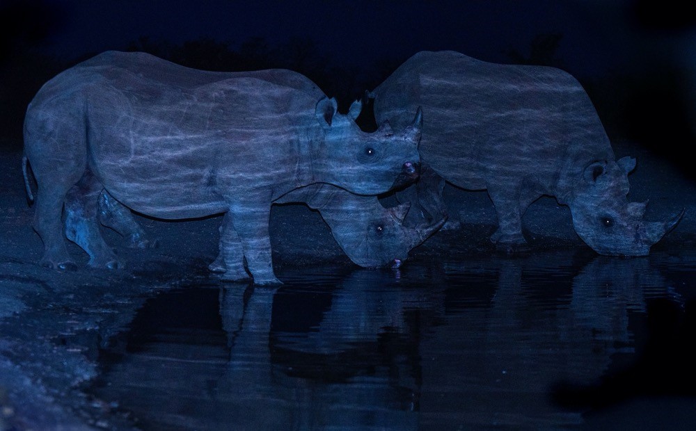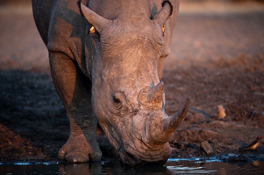 A relaxed white rhino with oxpecker earbuds slakes his thirst during the last light of day. That evening a rare photographic opportunity presents itself as three black rhinos use the cloak of darkness to cautiously drink.