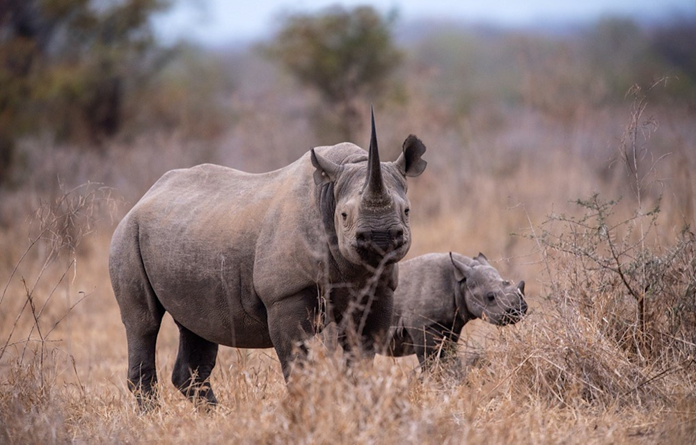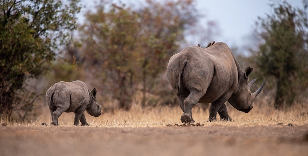 Back in the vehicle I drove around and cautiously made an approach. The mother came over, lined us up in her sights with her incredible horns, twitched her wet muzzle and then turned with her baby in tow, and went on her way. From her ear notches we can identify the mother and know her as Chilutsu. Prior to this sighting there had only been one confirmed sighting of the calf which was on the 22nd of April when it was estimated at one week old, so now, at just under five months, we can see that it’s thriving.