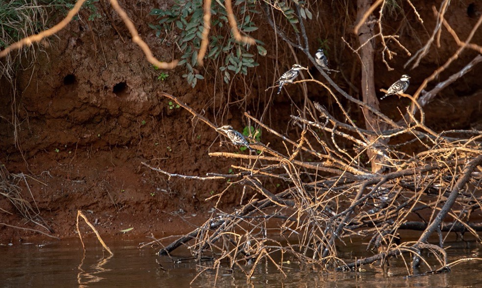 These pied kingfishers have dug out holes in this vertical mud bank for their nests. The nests are generally 4-5 feet deep. The adults perch nearby on this fallen tree and hunt by hovering over the water to detect prey and diving vertically bill-first to capture fish.