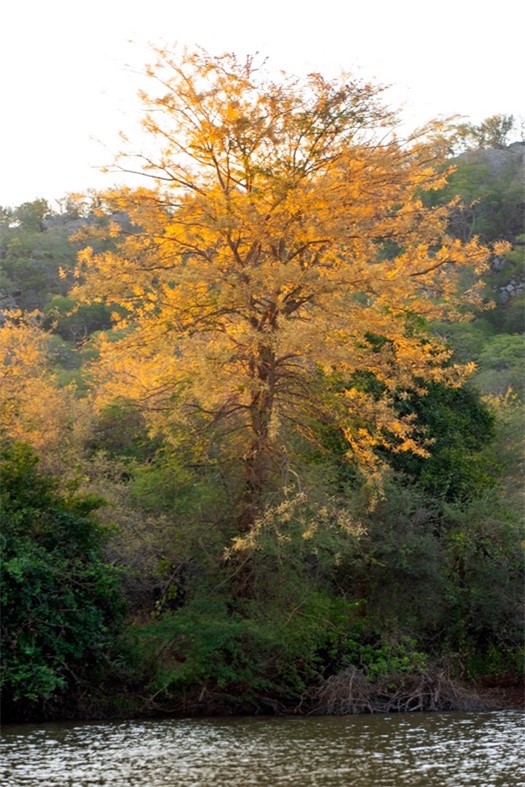 Taking a sunset cruise on the Malilangwe Dam has to be one of the most relaxing ways you can spend an afternoon, as opposed to tiger fishing on the dam which launches and plunges you through a whole gamut of emotions! At the moment some trees are so eye-catching as they glow a blossomy gold amongst the jungle green.