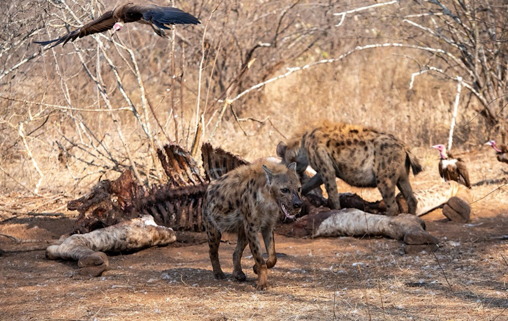 Most of the hyenas were resting in the shade, some chewing on a take-away meal. But they weren’t thrilled about the idea of the vultures feeding just yet. Some of the vultures – both white-backed and hooded, had used up their patience allowance and were coming in and bravely feeding alongside one hyena. It was quite entertaining to watch how that hyena would try to chase them off, or insist on feeding on the very spot where the vultures had been feeding. With much commotion they would fly off then creep back, their numbers swelling every time.