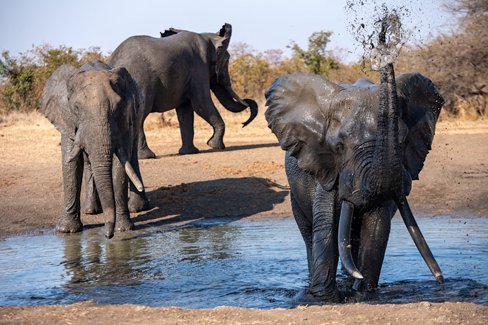 These three big fellas were having a whale of a time at the water – drinking, splashing and chilling. The fun was led by a bull we affectionately know as Butch, seen in the foreground, who has the angular and sunken forehead of old age, and impressive ivory even though they look more like ebony in this photo. The bull in the middle has a broken right tusk, and the one in the background is able to drape his trunk over his long right tusk.