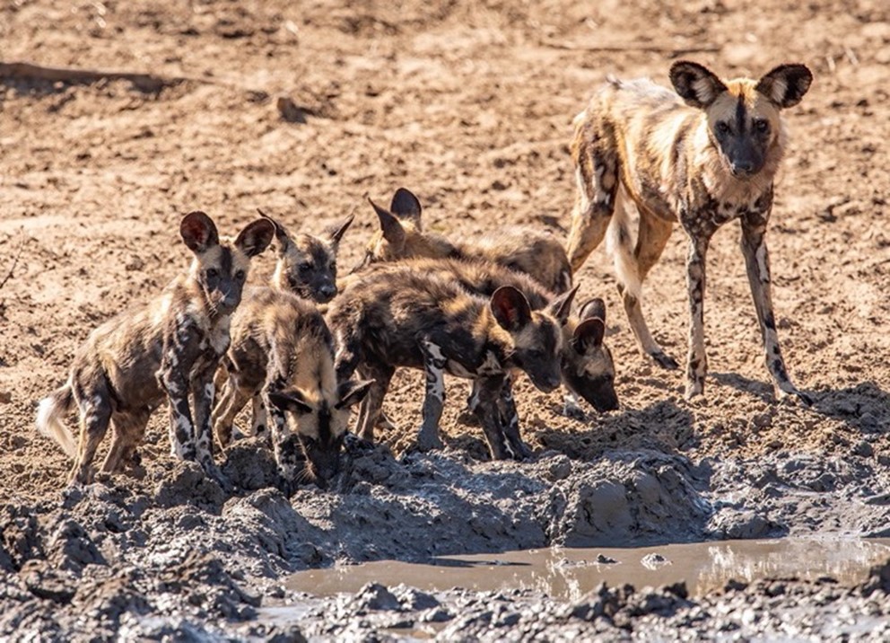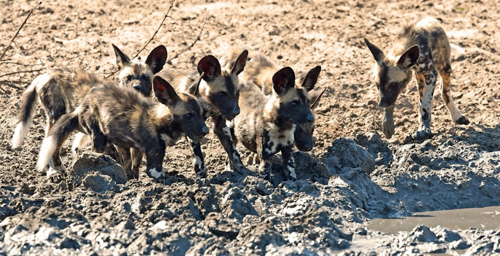 It is an absolute delight and privilege to see African wild dog (Lycaon pictus) pups. We are now seeing six of them out and about, and they are learning complex and often dangerous life lessons. One warm September morning some of the guides and trackers who didn’t have guests were out looking for sightings to call in to those that did have guests. I’d been in the far north following up on a report of wild dogs that had been seen along the boundary, that our scouts on dawn foot patrol had called in, but it was proving to be a wild goose chase.