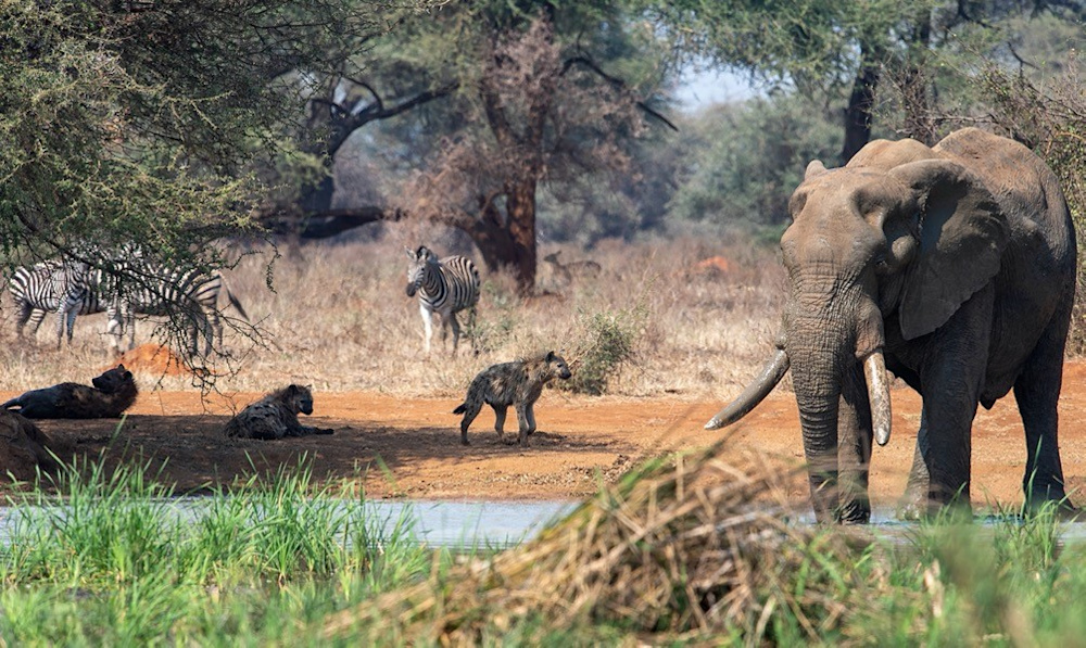 We’ve had some sweltering sizzling days, when the mercury has risen above 40˚C and it’s just too hot to bicker or bite or budge. In this first image you can see an elephant, clan of hyenas, small herd of zebras and even an impala gathered at the water and the cool shade of the large trees nearby. Unlike most predators hyenas seem to enjoy being in water. They sometimes even stash a carcass in water to keep it safe and preserve it, and will go and fish it out to feed on some time later. Some of the members of this clan couldn’t resist going to sit and lie down in the water to cool off, regardless of this enormous bull elephant a few steps away.