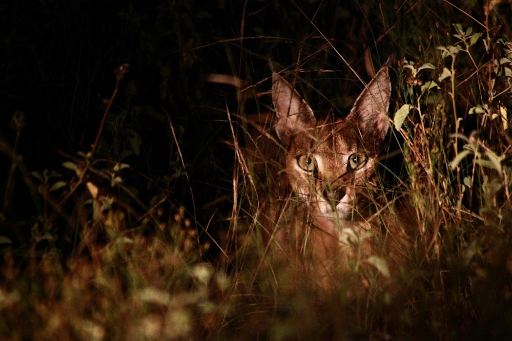 I edged the vehicle forward to take a closer look and to our amazement she remained still, her amber eyes peering up in curiosity. I have never had the privilege of photographing a caracal, but tonight was different. We shared a magic moment in silence, and as if it had all been a dream, then she turned and slinked off leaving only the fireflies glittering in the long grass.