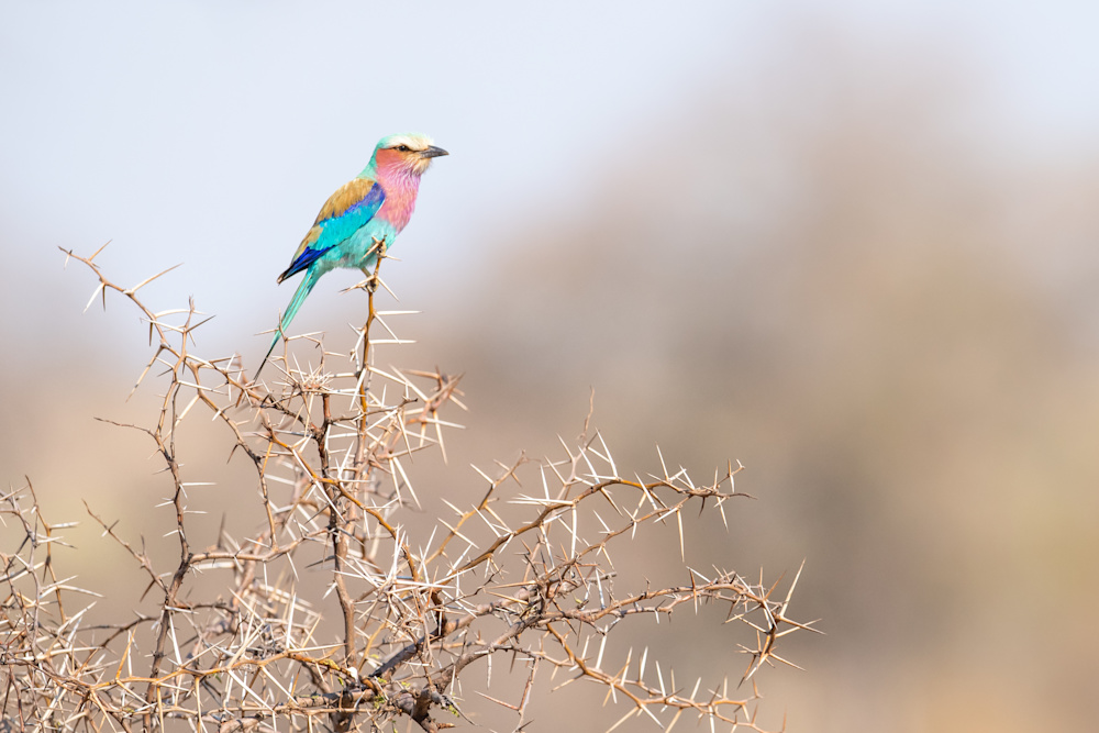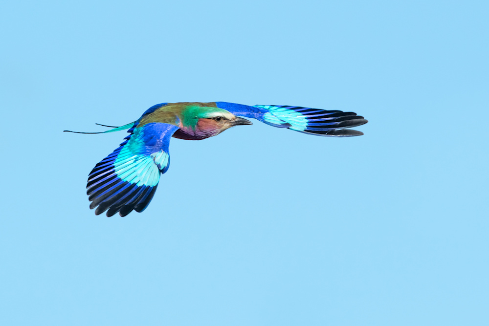 A lilac breasted roller in flight. The colour blue that we see is produced by the structure of the feathers, made up of keratin that reflect specific wavelengths of light. Only yellow and red feathers get their colour from actual pigments, called carotenoids, that are found in the food of birds.