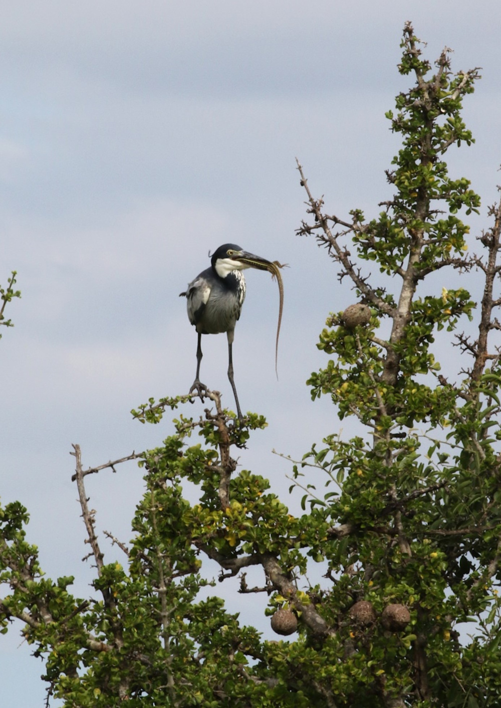 Out on a drive with our trainee guides, we were lucky enough to stumble across a number of black-headed herons that were hunting the grassland close to Gardenia Waterhole. Some individuals were in flight and returning to rest in the trees surrounding the waterhole when we noticed one with something particularly eye-catching hanging from its bill… A plated lizard! This heron had ambushed one of the larger lizard species and made a meal out of it.