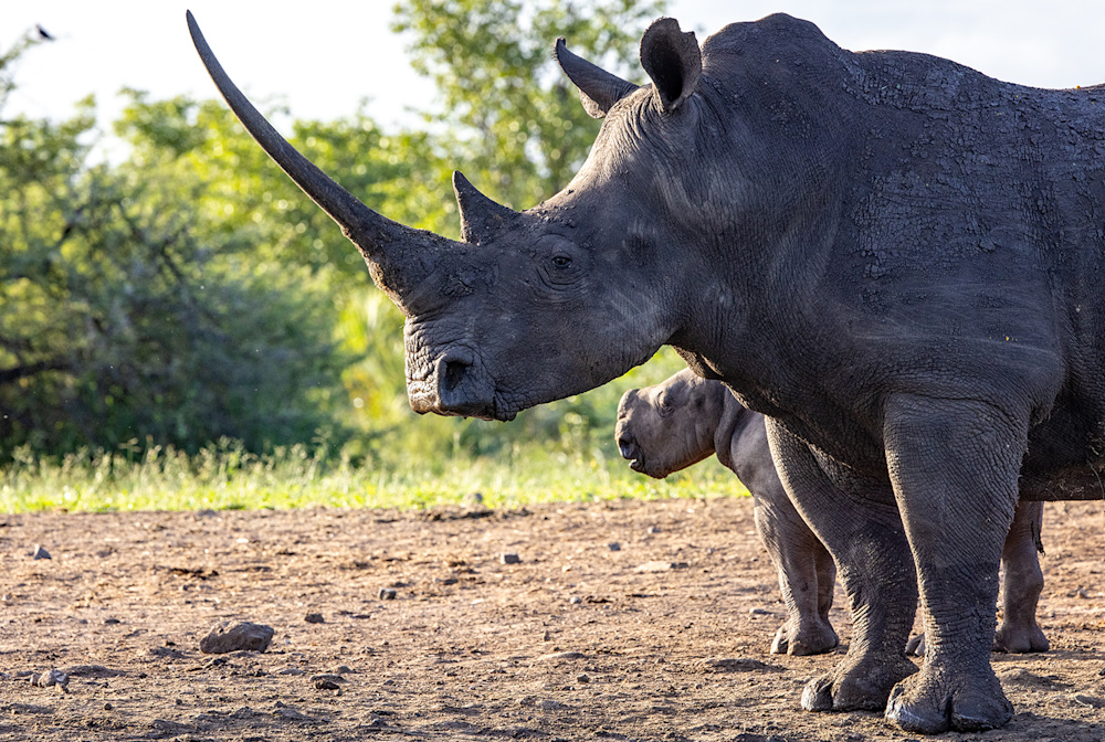 Crashes of several white rhinos are often seen grazing or drinking together. Highlights include a white rhino bull using a termite mound as a pillow, and a mother with a newborn infant.