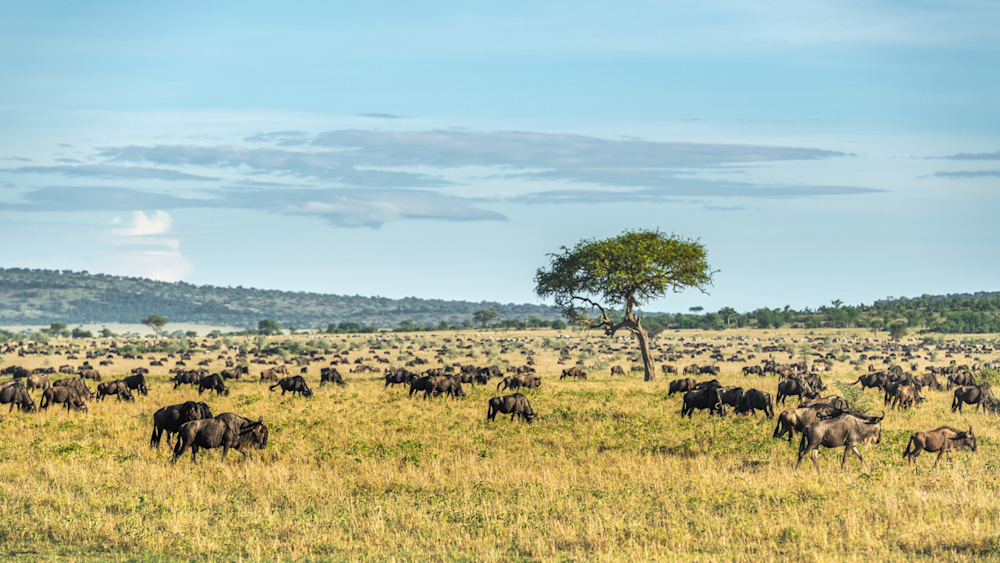 Perhaps it’s because food and water are everywhere, a consequence of the unusual intense El Niño. From October last year until this May, we experienced one of the most significant El Niño events in recent memory. The sky poured its heart out, drenching the land with incessant rain. Puddles turned to ponds, and the earth, usually so accommodating, struggled to drink up all the water. This abundance of resources meant the wildebeests could find sustenance throughout the landscape, reducing their need to move in their traditional massive herds.