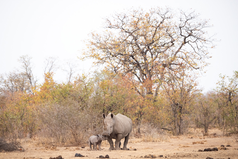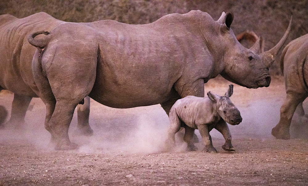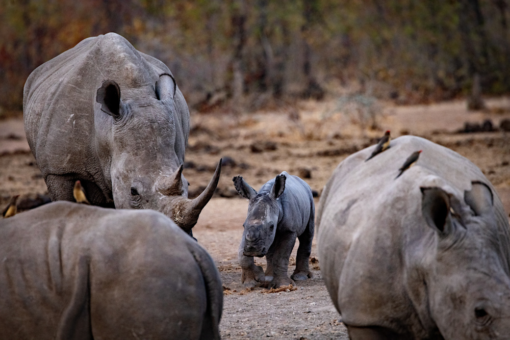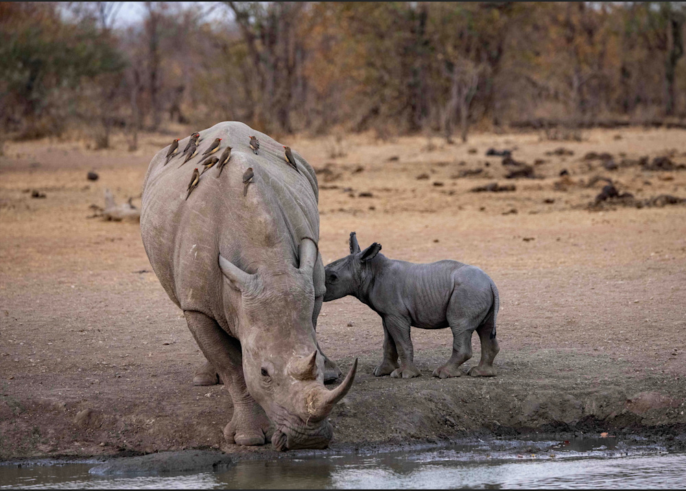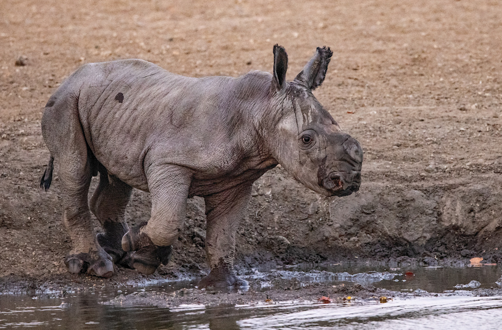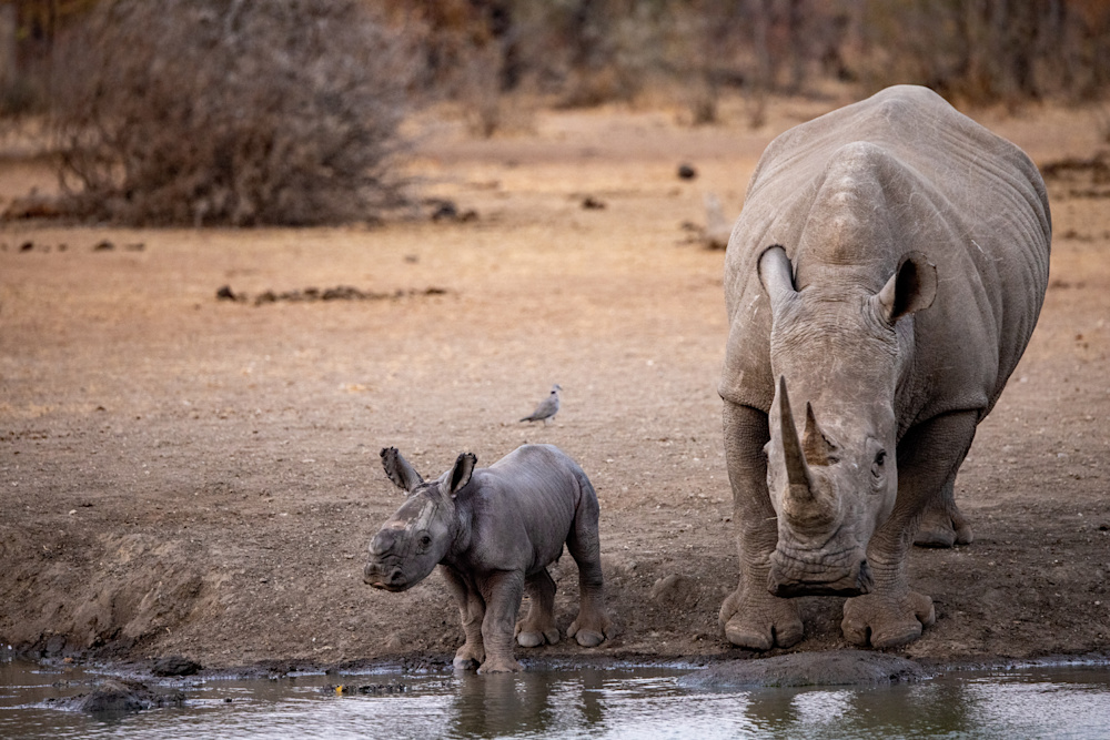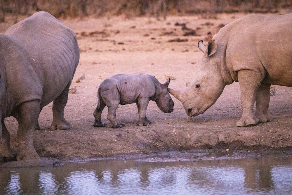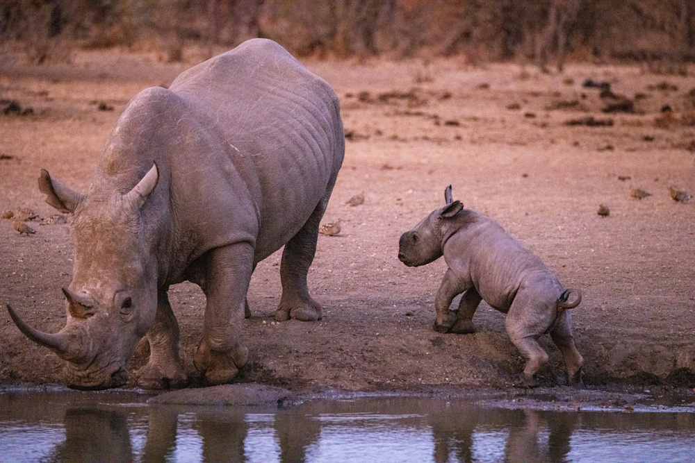 After being off the property for a period of time each of us likes to go on a short drive, as soon as possible, to reacquaint ourselves with this wild world. This usually takes the form of having a sundowner on the Banyini or at one of the nearby pans. I did exactly that and was delighting in the company of a couple of white rhinos that had come to drink. In the distance another rhino was making her way to the water, but then I noticed a little smudge of grey behind her.