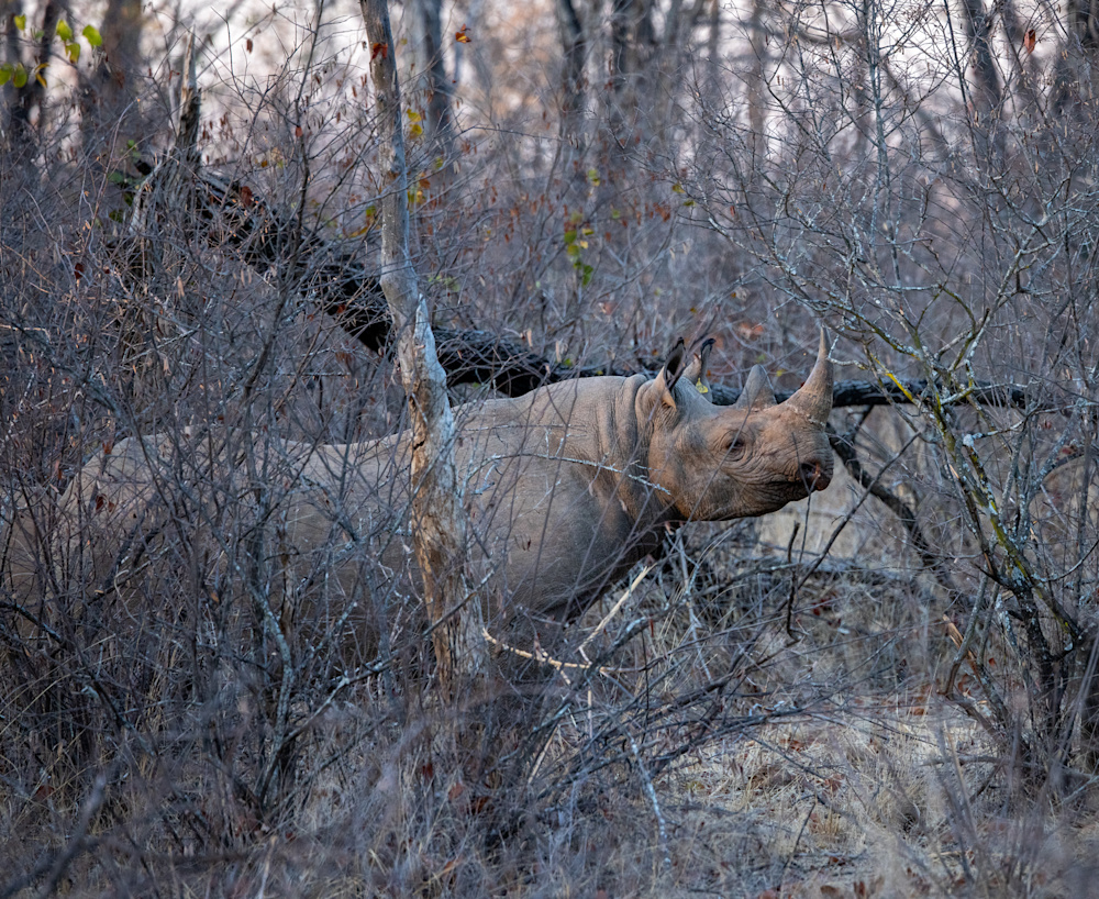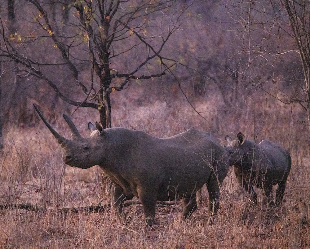 The second horn on the rhino mother photographed below is also a tremendous size, and unusual shape. Her calf is also showing great horn growth for its age.