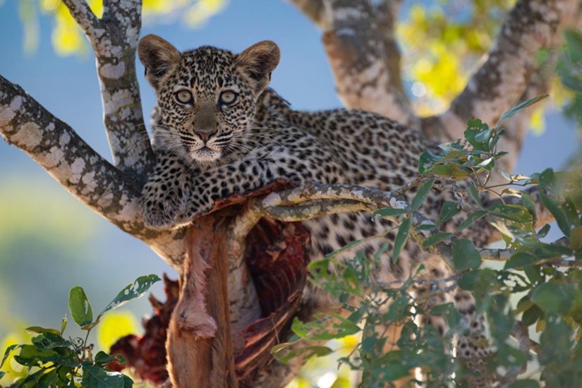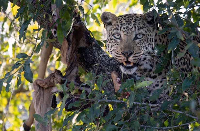 The following afternoon, in a neighbouring tree, a new impala was strung up, and the same process ensued, with each leopard taking their turn to feed and then moving down to rest contentedly amongst the cool rocks in the riverbed. By the following day all of them, and the carcass, were gone, and after some searching found with a bushbuck kill in another tree further downstream.