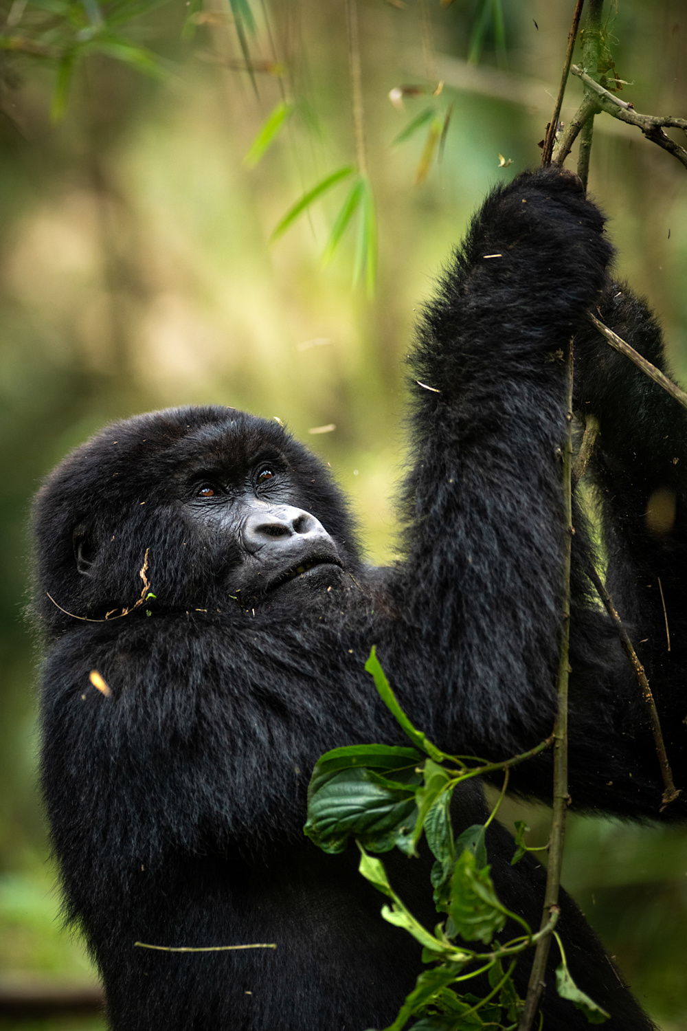 If you are in the position to do so, bring two cameras (this is recommended for professional photographers) as switching between two lenses without delays will allow you shot versatility. Having a wide-angle lens to capture the broader environment and the gorillas’ lush habitat can add context to your images (a 24-70mm would be prefect for this). Gorillas sometimes pull a Houdini and completely ignore your presence, casually strolling within metres of you – cue a mad scramble to yank your phone from your pocket in time.