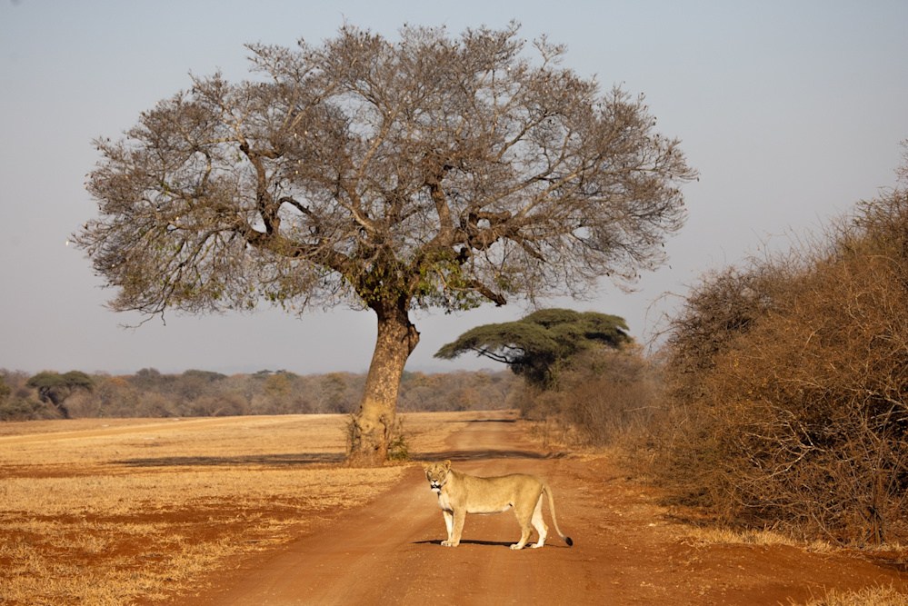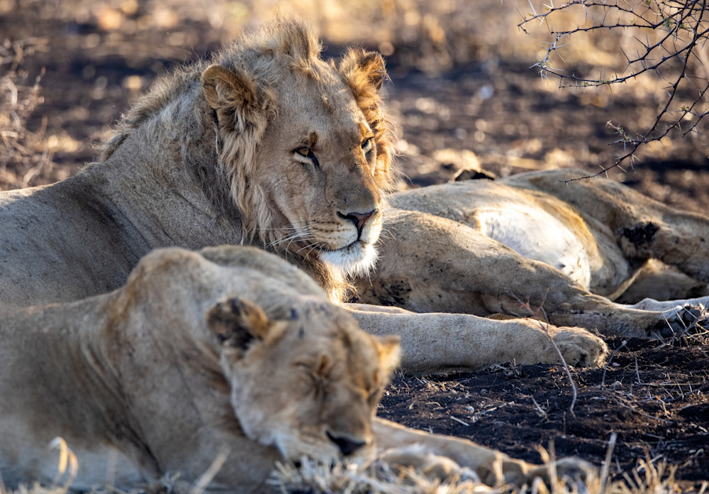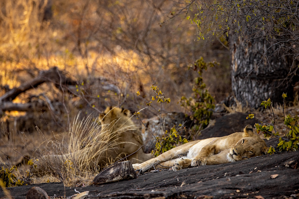 Just like domestic cats, lions are fussy. They like to be warm when it’s cold, and cool when it’s hot, and will go to great lengths to find the spots that suit them best. We were delighted to find the Nduna Split Pride near Simbiri Dam, with one of the lionesses lying on the warm rocks that overlooks the currently dry dam. She was in full shade at the time as the sun had only just begun sending out tendrils of light, but I knew that in a short while it would cast her in golden light and make a beautiful photograph.