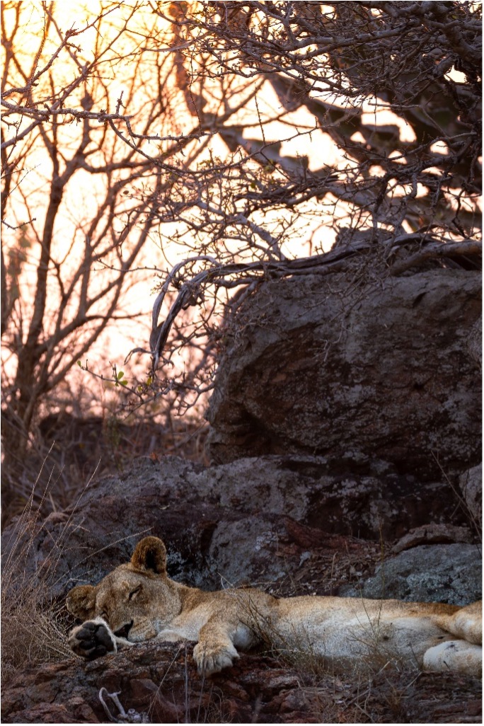 - The Zamani male surprised us one morning while we were tracking lions. He came over a small ridge and strolled down the road, intermittently marking his territory by spraying urine on a few prominent guarri bushes. A few days later he managed to successfully hunt an impala which he hoisted in a tree.