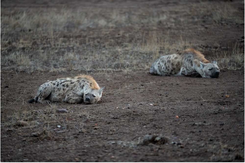 - A clan of five, possibly the same group as the ones seen at Pony Pan, were found the next day resting near an old impala carcass that had been hoisted into the fork of a large apple-leaf tree.