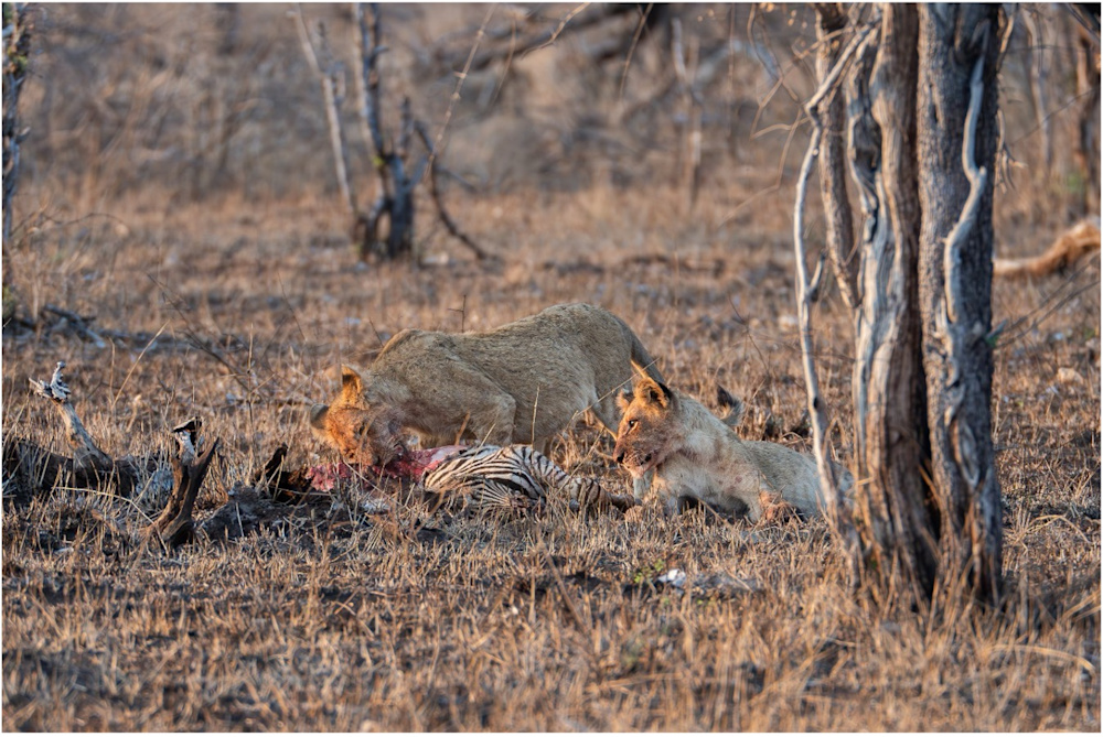- The Shish Pride was last seen at the end of September and then decided to go west out of our concession and into the Kruger National Park, where we occasionally see them on the H6 in the evenings. Due to the presence of unknown male lions exploring the now available territory of the late Trichardt males, the Shish Pride are not following their regular patterns and are spending a lot of time west of our concession. The one female with a limp was seen near Maputo pan, contact calling, most likely looking for the rest of the pride. Because of her limp, it is not uncommon to see her alone now and again. Fortunately, she always finds her sisters after a few days. At the end of the month they caught a female giraffe which they fed on for two days before heading back west.