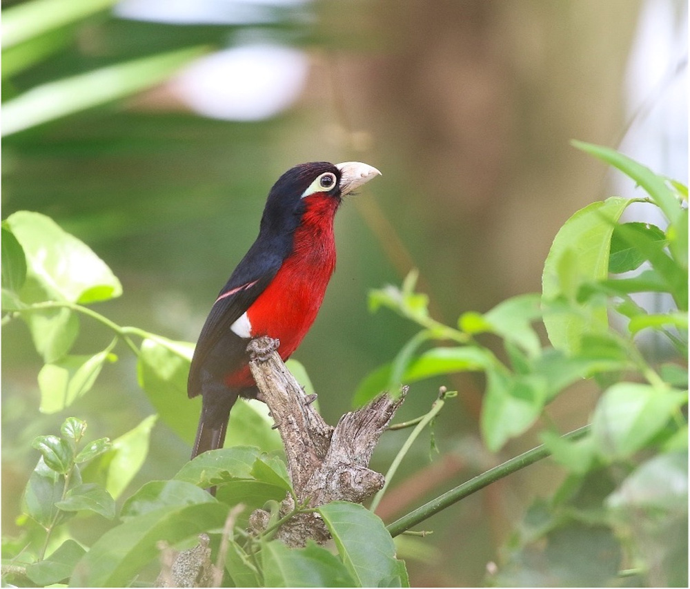 The double-toothed barbet is named for the two prominent "tooth-like" notches on its beak, which help it tear apart fruit and capture insects. As you can see from this photo they are especially eye-catching with their vibrant black, red, and white plumage, which makes them stand out in forested habitats. They feed on fruits but are opportunistic feeders that also consume insects and small vertebrates. These birds produce a loud and repetitive call that helps them establish territory and communicate with mates. They are native to tropical parts of Africa, where they prefer wooded and forested areas. What a joy to see one here at Singita Grumeti!