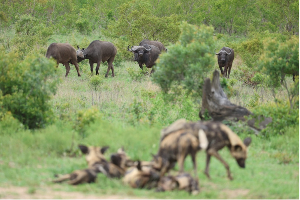 - The large herds of buffalo continue to frequent the southern areas of the property. Disturbing all animals including the wild dogs that rest at some of the waterholes during the heat of the day, and being disturbed by the prides and coalitions of lions in the southern parts of the reserve.