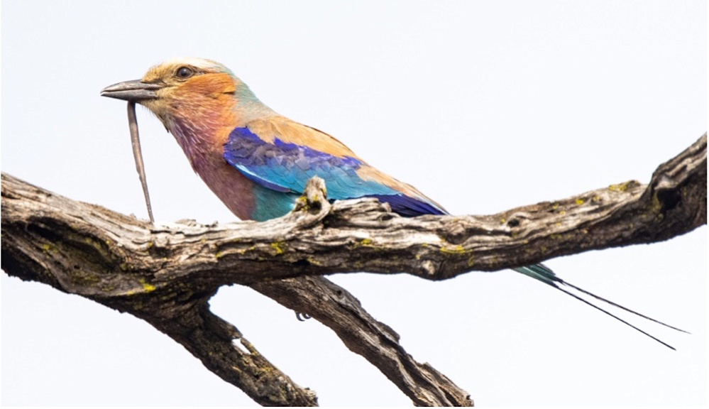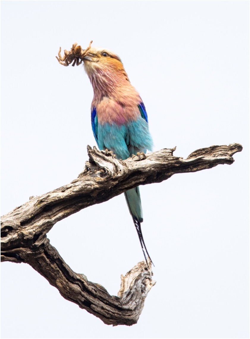 Driving along a muddy track I noticed a lilac-breasted roller perched in a tree with something odd in its beak. I reversed back to see what it was, thinking it might be a little snake, and indeed it was. This was quite unusual, but as I watched him I was surprised that he didn’t try to swallow it. Nearby was another lilac-breasted roller, and it soon dawned on me what was happening. It’s the time of year when insects and other prey are abundant, and birds feast on the prey to bulk up, mate, lay eggs, incubate them, and feed the hungry chicks. This male roller was trying to woo a female to mate with him by bringing her what is known as a “nuptial gift”.
