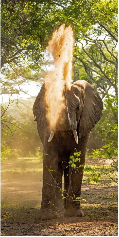 In woodland areas where trees provide partial shade, dust bathing is often a communal activity, with groups of elephants gathering together to indulge in the ritual, enjoying both the social interaction and the benefits of the bath.