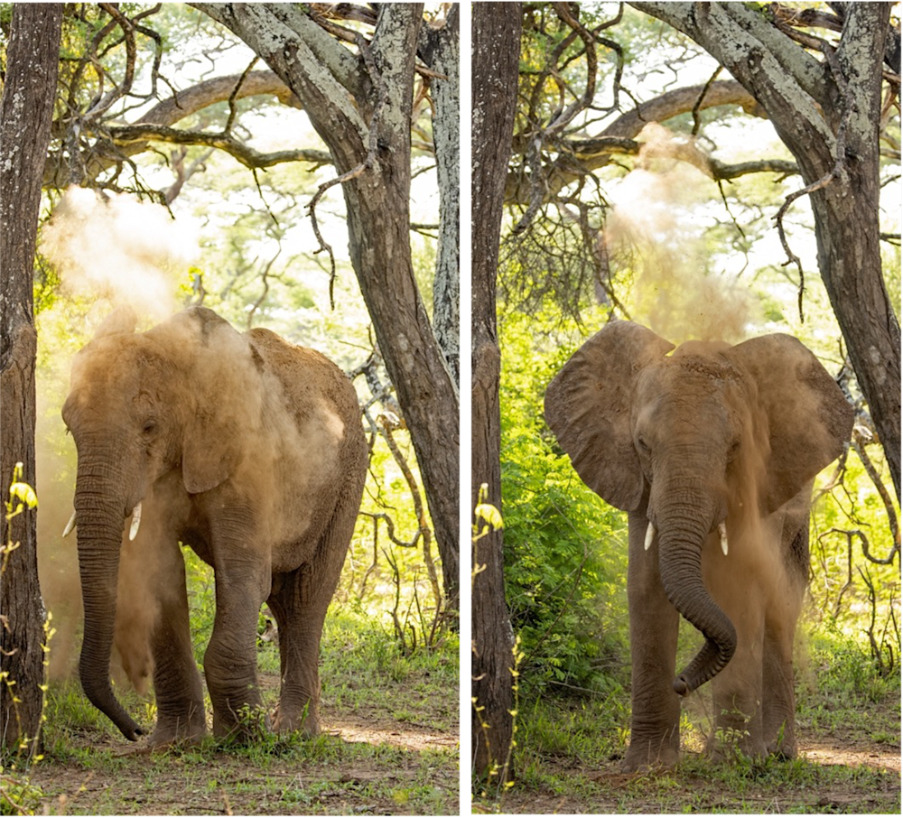 When elephants throw dust over their bodies, it helps to protect their skin from the harsh sun and biting insects. The morning was just revving up to be a scorching day, so their timing in “the powder room” was perfect.