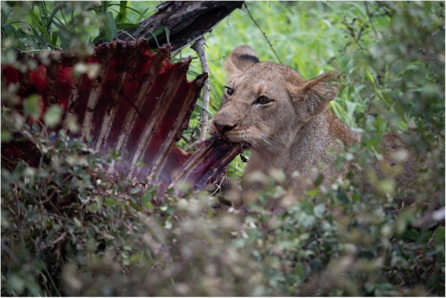- The Chava Pride and the blonde-maned Sonop male were found on a buffalo bull carcass in the north-west. It seems as if the fact that the large herds of buffalo have dispersed into smaller groups has resulted in their demise. On the 11th we found the Chava Pride with full bellies near Gudzane Dam. One of the females was walking steadily in a northerly direction. Her mammary glands seemed to be filled with milk and lionesses don’t usually leave the pride with a carcass unless they are heading to… new cubs! We followed her to a rocky ridge, with vegetation creating the perfect den-site. Little cries from inside the vegetation proved our suspicions. At the end of the month three of the Chava Pride females managed to take down a wildebeest on Cassia Open Area where the game has been prolific the last couple of weeks.