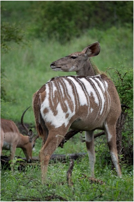 - The leucistic kudu has been seen again in the area just north of the lodges. She is growing up quickly and looks like she might just be pregnant with her first calf.