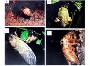 A. Underground nymph; B. Adult cicada hatching from the nymph stage; C. Hatched adult cicada; D. Cicada nymph exoskeleton.