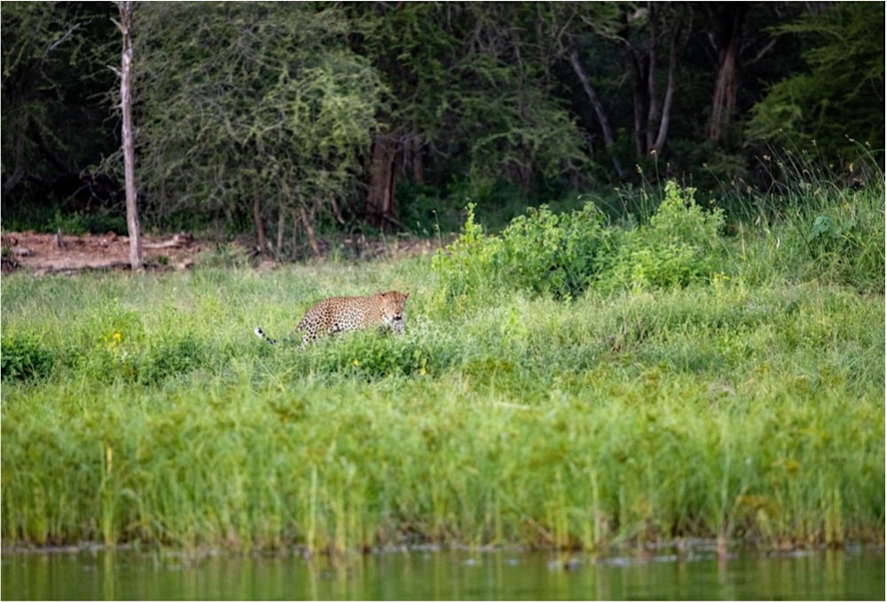 - The boat cruises provided two lucky leopard sightings. The one of a territorial male is detailed in this journal, and the other was of an adult female that had possibly killed a waterbuck calf, with the mother waterbuck in full pursuit of the carnivorous cat, trying to prevent it from eating the calf.