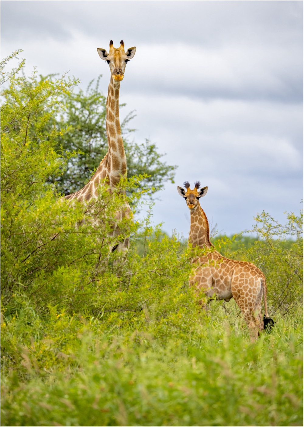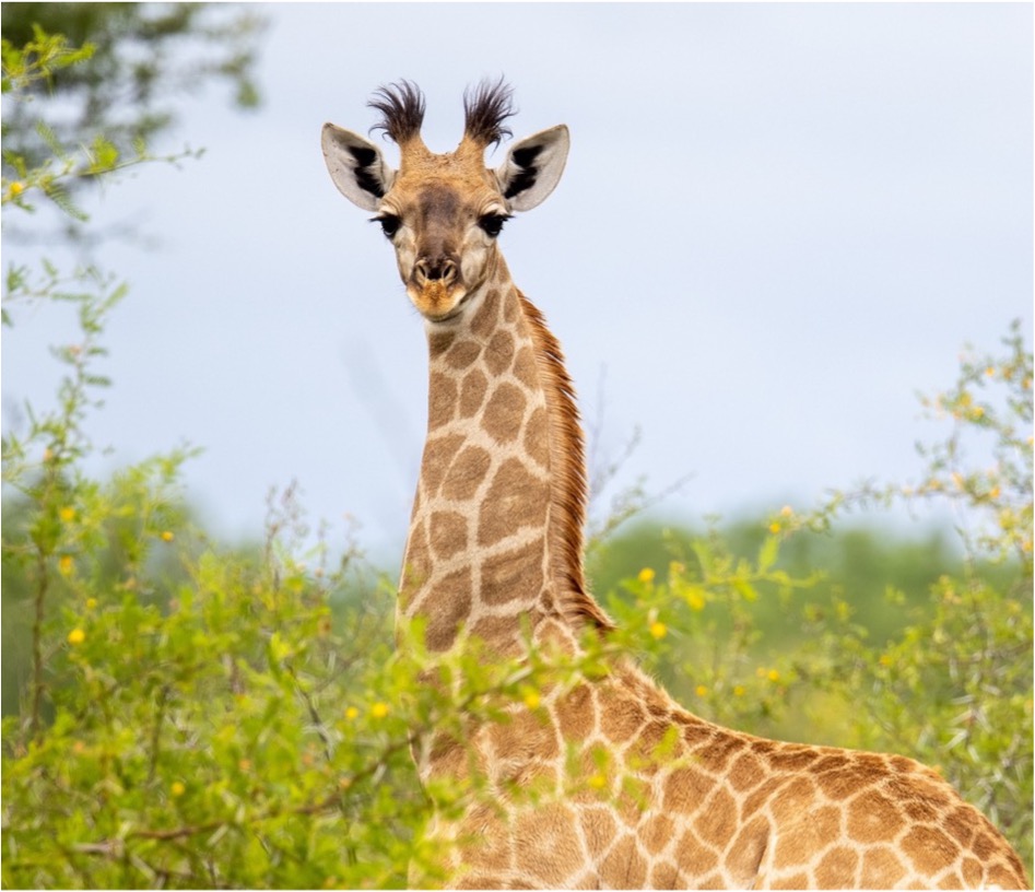 It had rained and the clouds were departing when we drove through an area of thorn trees that have a particularly sweet scent. You can smell the delicious aroma before you see them. Once amid the bright green leaves and yellow blossoms we saw a mother giraffe and her curious young calf. The calf was adorable and had long black tufts on his ossicones that were all wet and wavy from the rain. The ossicones of adult female giraffes have short black hair, while males are usually bald from sparring. However, all giraffes are born with long black hair on their ossicones.