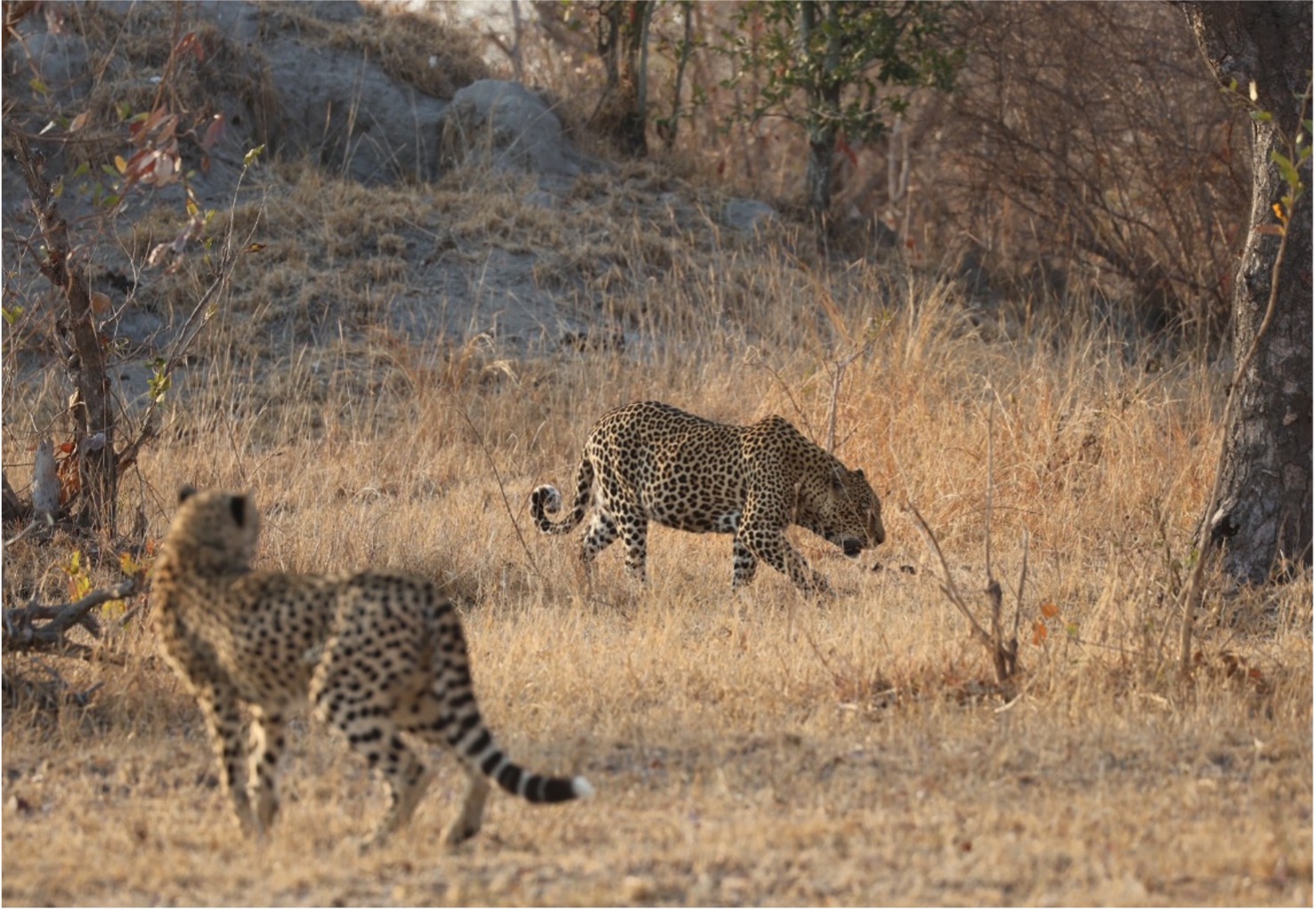 Thamba, easily double the size of the cheetah female, seemed utterly unbothered. He circled the group, sniffing the ground and even checking nearby trees as if expecting to find a hidden kill. Of course, cheetahs cannot hoist their prey into trees as leopards do, and eventually, realizing there was nothing to gain, Thamba lost interest and moved off.