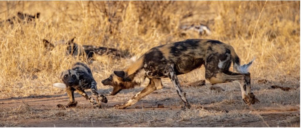 During the last light of golden hour the adults began to stir. It’s fascinating to watch the greeting ceremony and watch the dynamics of hierarchy – the submissive posturing and the graceful dominance of the alpha pair. The adults bow, stretch, white tail tips up, and nuzzle one another. Then some of them will interact with the pups, running circles around them and chasing them, but very definitely reminding them to be submissive and not get too big for their boots. Wild dogs need to act as one unit to be successful, and pups that try to go off on their own or act up are quickly reprimanded.