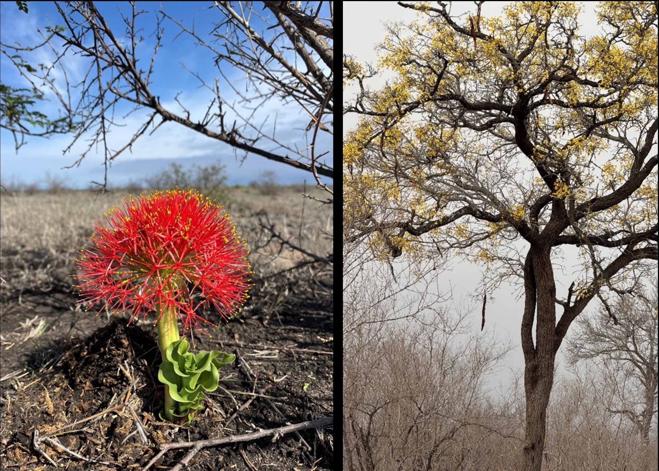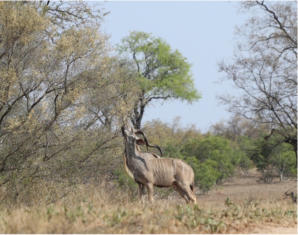 Freshly blossomed flowers from the red and russet bushwillow trees have been popular for kudu and giraffe currently. The first signs of green push through in the landscape. Image by Marc Bowes-Taylor.
